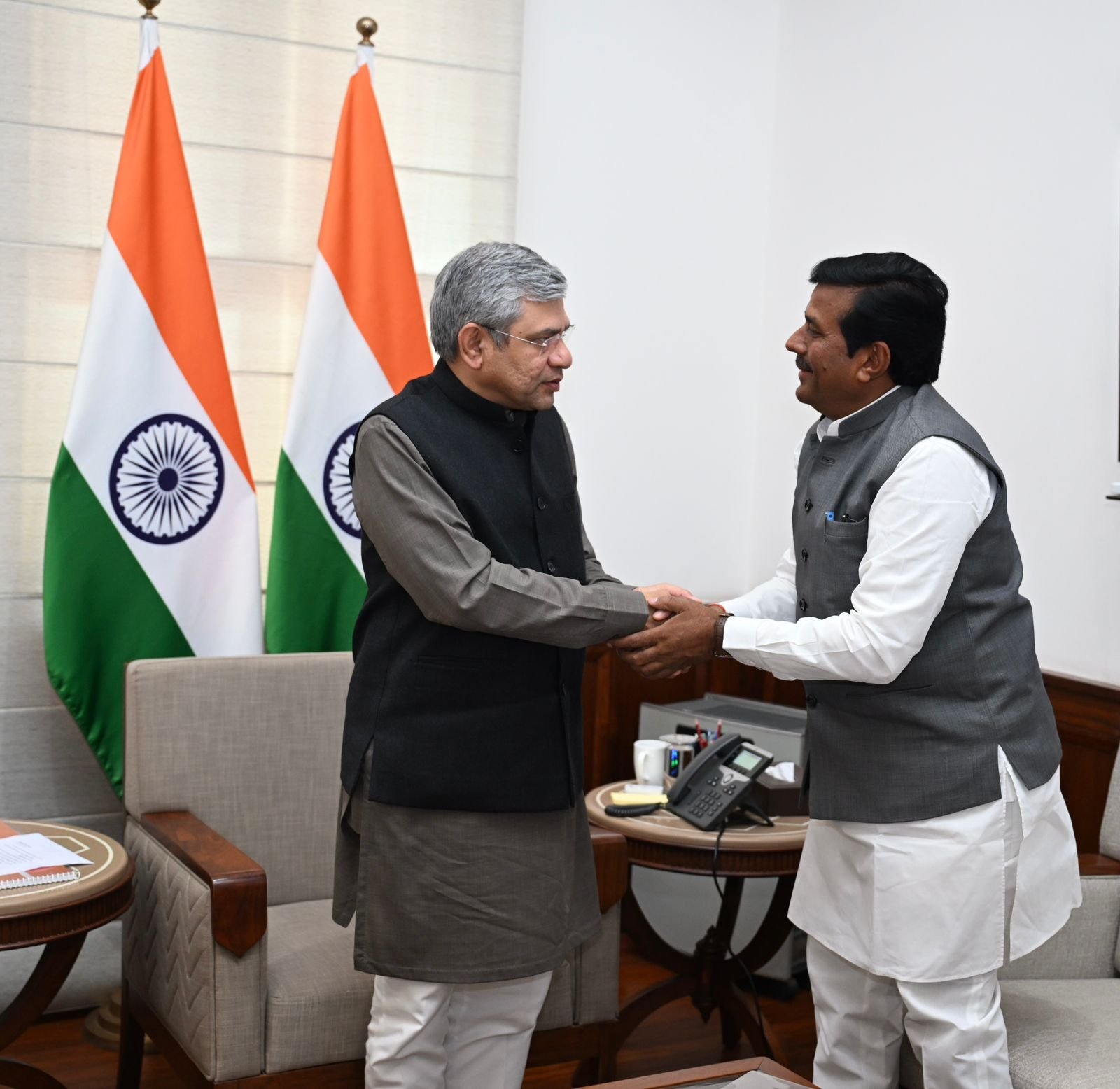 Bharat Meet Ashwini: खजुराहो से सवाई माधौपुर तक नई रेलवे लाइन को लेकर सांसद भारत सिंह कुशवाह ने केंद्रीय रेल मंत्री अश्विनी वैष्णव से मुलाकात कर औपचारिक मांग रखी है। सांसद ने रेल मंत्री को पत्र सौंपते हुए खजुराहो–झांसी रेल सुविधा को आगे बढ़ाकर करैरा, शिवपुरी, पोहरी और श्योपुर के रास्ते सवाई माधौपुर तक जोड़ने का प्रस्ताव दिया।