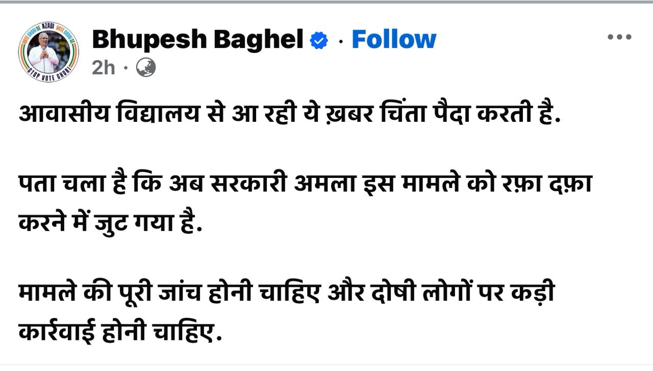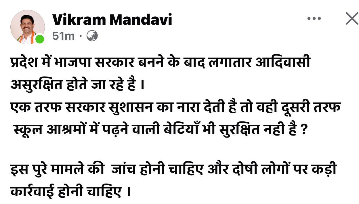 वहीं इस मामले में पूर्व मुख्यमंत्री भूपेश बघेल ने चिंता जताते हुए निष्पक्ष जांच और दोषियों पर सख्त कार्रवाई की मांग की है। उन्होंने आरोप लगाया कि प्रशासन इस मामले को दबाने की कोशिश कर रहा है। जबकि बीजापुर के विधायक विक्रम मंडावी ने भी राज्य सरकार पर निशाना साधते हुए कहा कि प्रदेश में आदिवासी समुदाय की सुरक्षा को लेकर गंभीर सवाल खड़े हो रहे हैं। उन्होंने कहा कि जब आवासीय स्कूलों में पढ़ने वाली छात्राएं ही सुरक्षित नहीं हैं, तो सरकार के सुशासन के दावों पर सवाल उठना स्वाभाविक है।