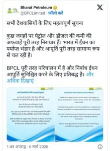 BPCL ने अपने बयान में कहा कि हम सभी ग्राहकों के लिए बिना किसी रुकावट के ईंधन सुनिश्चित करने के लिए प्रतिबद्ध हैं। कृपया केवल ऑफिशियल सोर्स से मिली जानकारी पर ही भरोसा करें।