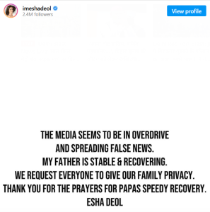 FAKE NEWS: ईशा देओल ने अपने आधिकारिक सोशल मीडिया अकाउंट पर पोस्ट साझा कर लिखा “ऐसा लगता है कि मीडिया हद से ज़्यादा झूठी खबरें फैला रहा है। मेरे पिताजी की हालत स्थिर है और वे ठीक हो रहे हैं। हम सभी से अनुरोध करते हैं कि वे हमारे परिवार को गोपनीयता प्रदान करें। पापा के शीघ्र स्वस्थ होने की प्रार्थना के लिए थैंक्यू।”- ईशा देओल
