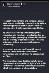 इस मामले पर अभिनेता मनोज बाजपेयी ने भी सोशल मीडिया के जरिए अपनी चुप्पी तोड़ी है। उन्होंने लिखा कि वह लोगों की भावनाओं और चिंताओं का सम्मान करते हैं और उन्हें गंभीरता से लेते हैं। मनोज बाजपेयी ने कहा कि एक अभिनेता के तौर पर वह कहानी और किरदार से जुड़ते हैं और उनके लिए यह फिल्म एक गलत व्यक्ति और उसके आत्मबोध की यात्रा को दर्शाती है, न कि किसी समुदाय पर टिप्पणी। उन्होंने यह भी कहा कि सार्वजनिक भावनाओं को ध्यान में रखते हुए प्रमोशनल कंटेंट हटाने का फैसला लिया गया है, जो यह दिखाता है कि मेकर्स इस मुद्दे को कितनी गंभीरता से ले रहे हैं।